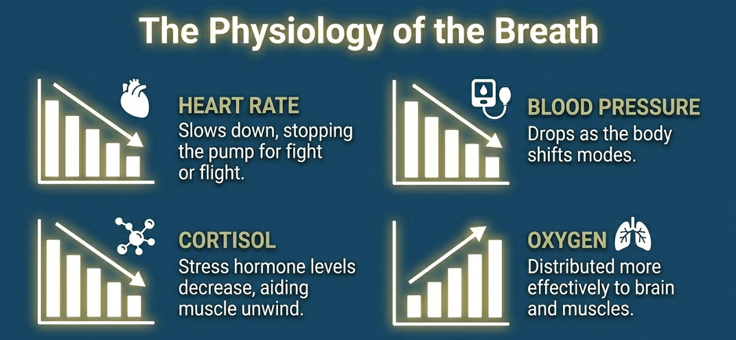 This is where the real physiological switch happens. Most people breathe into their chest when stressed. The shoulders rise, the breath is shallow, and the system stays in a “ready” or tense state.