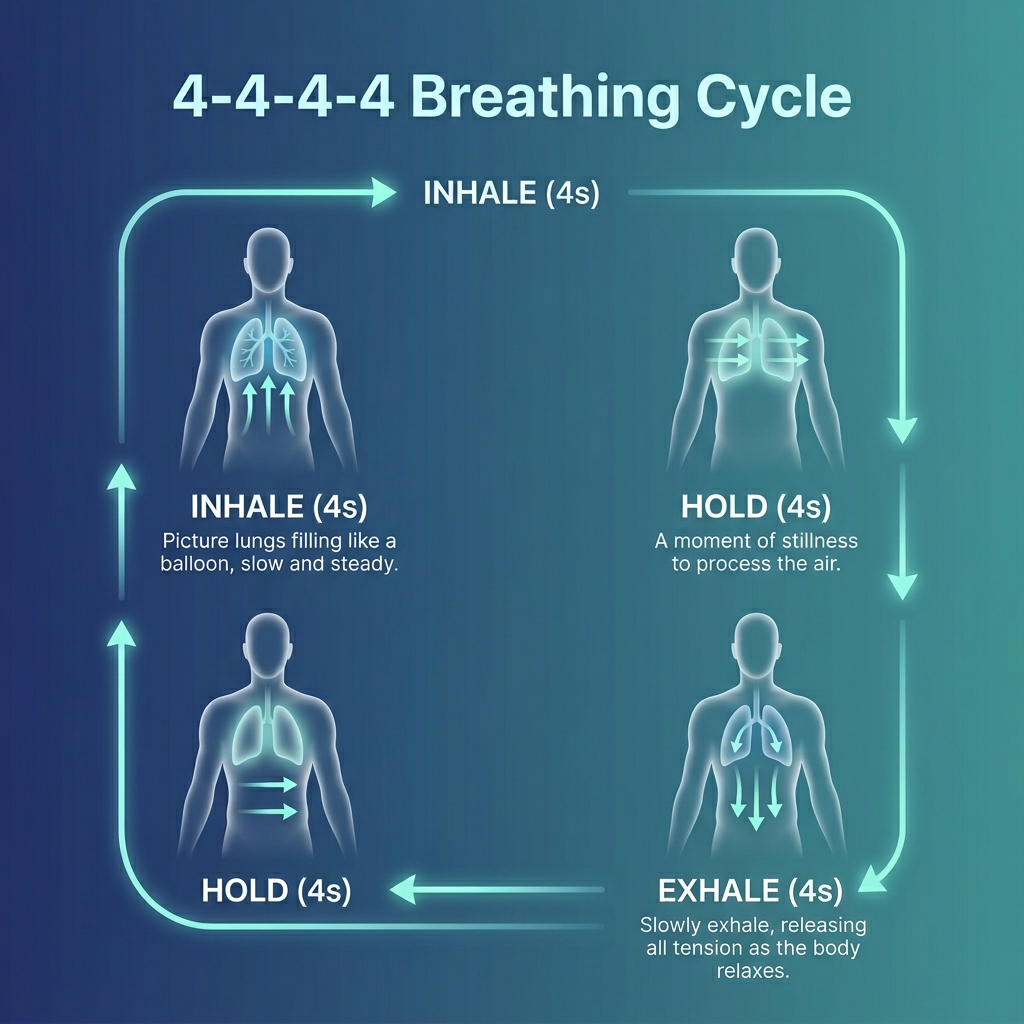 4 × 4 box breathing is a simple breathing pattern used to activate the parasympathetic nervous system, the part of your body responsible for calming, settling, and restoring balance.