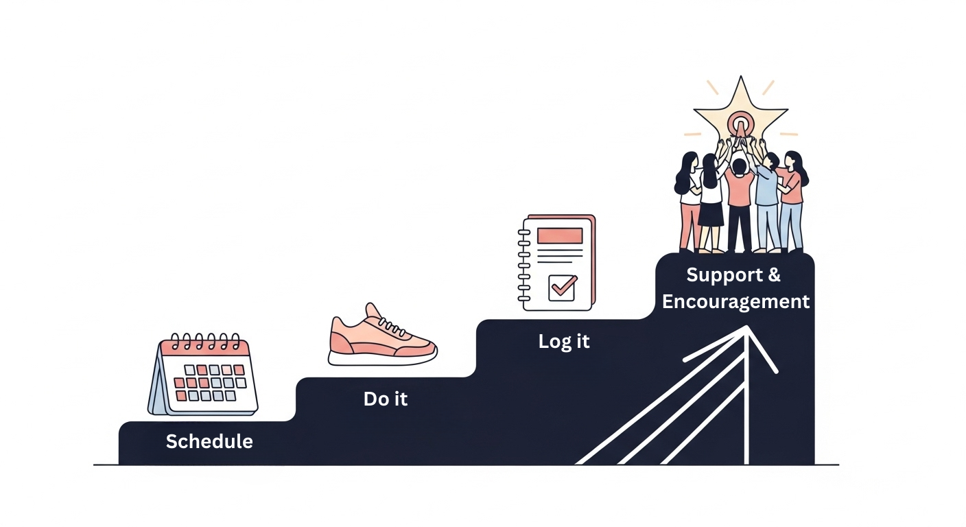 By scheduling your activities, doing them, and logging your progress, you’re not just keeping track of your health—you’re building a habit that will set you up for success in the long run.