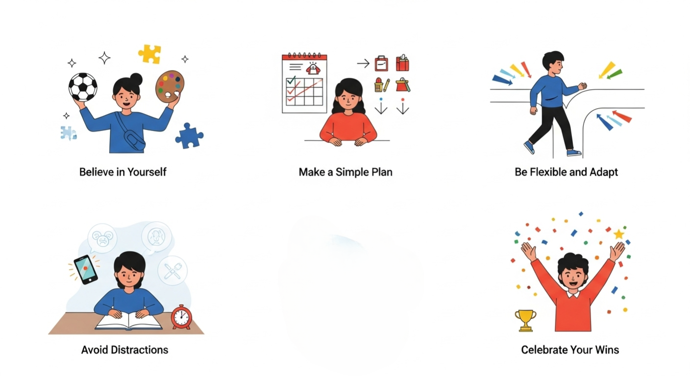 When you stick to your schedule and finish your tasks, celebrate! It could be something small like watching your favorite show, playing outside, or enjoying a snack. Feeling good about your progress will make you want to keep going.