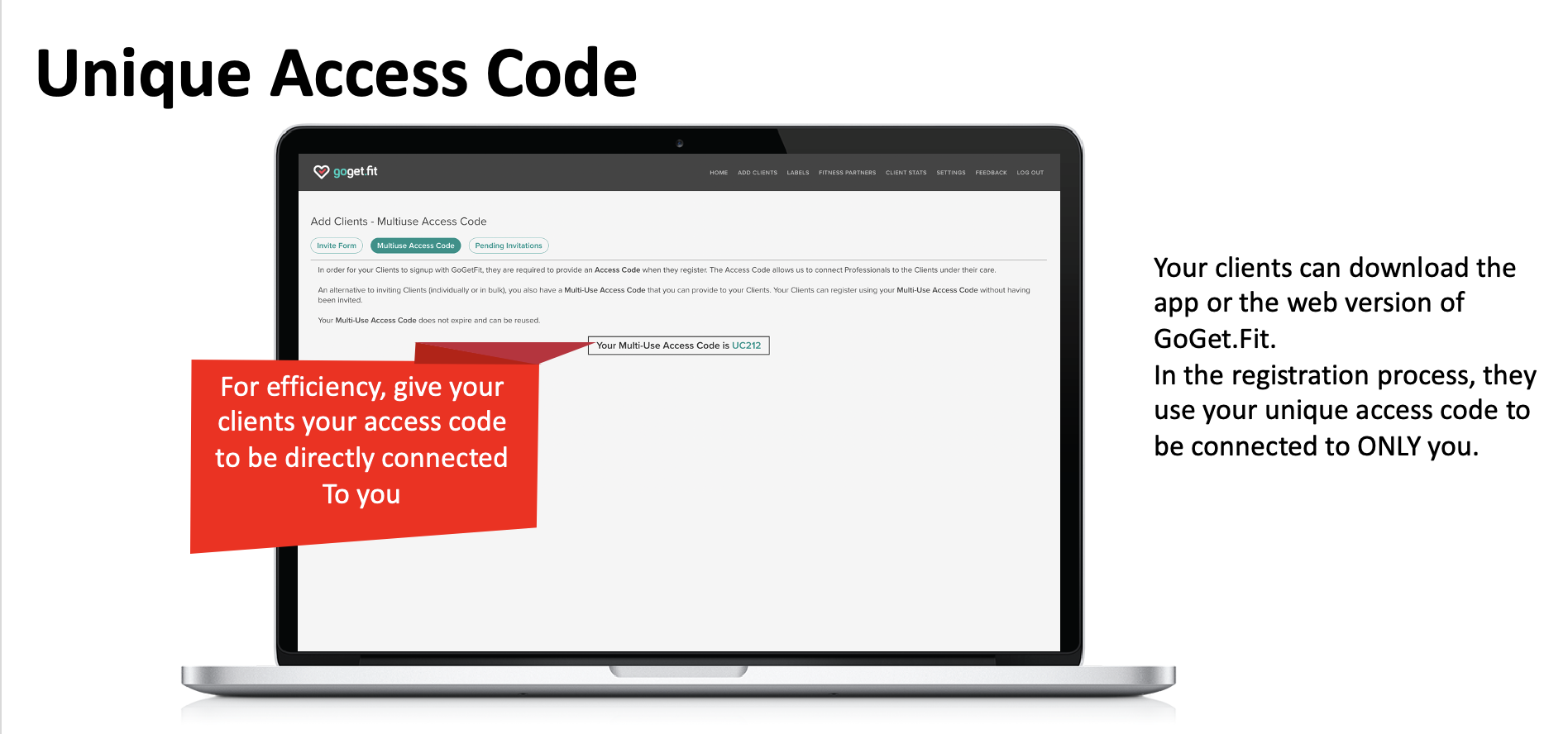 By giving this code directly, you don’t need to email your clients an invitation to sign up for GoGet.Fit.